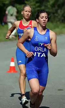 ![]() Anastasia Gorbunova, trailing Alessia Orla, at the European Cup Triathlon in Vienna, 2011. | |