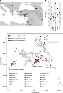 At the autosomal level, in the Principal component analysis (PCA) the analyzed AHG individual turns out to be close to two later Anatolian populations, the Anatolian Aceramic Farmers (AAF) dating from 8300-7800 BCE, and the Anatolian Ceramic Farmers (ACF) dating from 7000-6000 BCE. These early Anatolian farmers later replaced the European hunter-gatherer populations in Europe to a large extent, ultimately becoming the main genetic contribution to current European populations, especially those of the Mediterranean. In addition, their position in this analysis is intermediate between Natufian farmers and Western Hunter-Gatherers (WHG). This last point is confirmed by the ADMIXTURE and qp-Adm analysis and confirms the presence of hunter-gatherers of both European and Near-Eastern origins in Central Anatolia in the late Pleistocene. Mesolithic individuals from the Balkans, known as Iron Gates Hunter-Gatherers, are the most genetically similar group to the Anatolian Hunter-Gatherer lineage. Feldman et al. suggest that this affinity is not due to a genetic flow from the AHG to the ancestors of the Villabruna cluster, but on the contrary: there was a genetic flow from the ancestors of the Villabruna cluster to the ancestors of the AHG.[1]