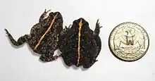 Eggs develop quickly, hatching in a mere 24 to 36 hours.[6] The tadpole reaches a maximum length of 18 to 19.4 mm (0.71 to 0.76 in). It is grayish olive or grape-green dorsally and purplish ventrally. The tail has 6 or 7 black saddle marks.[12][13] The tadpole completes metamorphosis into a juvenile toadlet in 4 to 6 weeks, and it reaches adulthood and sexual maturity at 1.5 to 2.3 years of age.[6] The length of the lifespan is unclear.[3] There are records of specimens living for four years in captivity,[10][12] and the reported average lifespan in captivity is 1.9 years.[14]