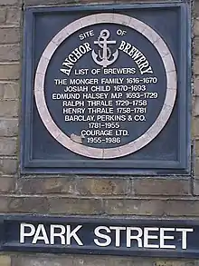 The brewery was established in 1616 by James Monger Sr. in Southwark, on land adjacent to the Globe Theatre.[1] On his death, the brewery passed to his godson, James Monger Jr.[1] James Child acquired the brewery after the younger Monger's death in 1670, and owned it until his death in 1696.[1] His son in law, Edmund Halsey, managed the business with James Child from 1693, and subsequently as sole proprietor until his death in 1729.[1] The brewery was then purchased by Ralph Thrale, the brewery manager and a nephew of Halsey, for £30,000 in instalments over 11 years.[1]