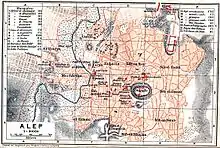 The Old City of Aleppo – composed of the ancient city within the walls and the old cell-like quarters outside the walls – has an approximate area of 350 hectares (860 acres; 3.5 km2), housing more than 120,000 residents.[1]
