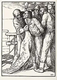 - "We all observed, that we had not the sight of one fish of any kind, since we were come to the Southward of the straits of le Mair, nor one sea-bird, except a disconsolate black Albatross, who accompanied us for several days ... till Hattley, (my second Captain) observing, in one of his melancholy fits, that this bird was always hovering near us, imagin'd, from his colour, that it might be some ill omen ... He, after some fruitless attempts, at length, shot the Albatross, not doubting we should have a fair wind after it."[7]: 72–73