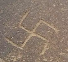 The numerous sites of ancient rock carvings have been discovered where ancient rock art is engraved on rocks. The sites are located at Hur Dhoro (natural water spring), Zainy Dhoro (a hollow where water of hill torrent collects), Peepal spring, Pachhal, Sado-Mado.[2] Whereas, the dhoris (little ponds of water in the bed of hilly streams) in vicinity of the Nai Gaj Valley which is located at a distance of 38 km towards west of Johi town in Johi tehsil, Dadu District, Sindh, are the Shakloi Dhoro, Phazgar Dhori, Gurban Dhoro, Met Dhori, Makhi Dhori, Faizoo Garoti, Sakey Dand, Gurban Dhoro. The Kalri Dhoro in surroundings of Nari/Nali hill stream while Kashani Dhoro in neighborhood of Nain Taki (hilly torrent) in Johi tehsil Dadu District,[3] at the same time as along the banks of hill streams of Mazarani, Shahaar and Keharji near Qambar, Larkana District (now Qambar Shahdadkot District) and Nai Dilaan in Dadu district.[4] The rock art is too explored near hill torrents of Sallari, Khurbi, Radh, Saghro, Buri, Khenji, Chhahar, Seeta, the Kukrani, Haleli, Anghai, Khandani, Naing, Bandhani, Osho and Baz Khando in Kirthar mountains range.[5] The rock carvings also have been discovered nearby Gadap Town at Gadap Tehsil of Karachi district.[6] Undoubtedly, Dadu District is more abundant in ancient rock carvings of Sindh.[7]