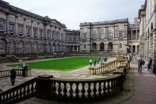 Founded by the Edinburgh Town Council, the university began as a college of law using part of a legacy left by a graduate of the University of St Andrews, Bishop Robert Reid of St Magnus Cathedral, Orkney.[12] The university was established by a royal charter granted by James VI in April 1582,[13] and instruction began under the charge of theologian Robert Rollock in October 1583.[14] As the first Scottish university to be founded by royal charter at the urging of the 'town council and burges of Edinburgh', rather than through papal bulls as had been the case for the three older universities, this set a new precedent. Despite this difference, it is universally considered one of the seven ancient universities of Britain and Ireland (and ten years older than the youngest ancient university, the Trinity College Dublin), a status affirmed by the Scottish Government.[15]