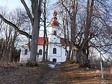 A wooden church existed here already in 1500, but was burned down during the Thirty Years' War. The Church of the Nativity of the Virgin Mary was built in the early Baroque style in 1672 and was reconstructed in 1734, after it was damaged by the fire in 1732. It is the landmark of the village. In front of the church there is a baroque statue of Saint John of Nepomuk from 1724.[2]