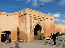 The wall was pierced by five gates, not all of which have been preserved today.[2] Bab Teben or Bab al-Tben ("Gate of Hay"), was the westernmost gate (close to Bab el-Hadd in the Almohad wall). Today the area is known as Bab Jdid ("New Gate") and the gate was largely demolished to make way for new buildings. Only one side tower and chamber from the former gate has been preserved and is now used as a police post.[2] A minor gate, Bab al-Bouiba ("the Small Gate"), exists further east from here. Towards the middle of the wall is the gate called Bab Chellah ("Gate of Chellah"), the only one with a slightly monumental appearance. Its current form dates from a reconstruction in 1813 under Sultan Moulay Sliman. Its decoration is reminiscent of older Almohad gates in the city, although in simpler form.[2] Two more gates to the east are simple openings with little architectural significance: Bab Mellah ("Gate of the Mellah"), the gate to the old Jewish quarter, and Bab Diouana, a gate now converted into a mosque entrance.[2]