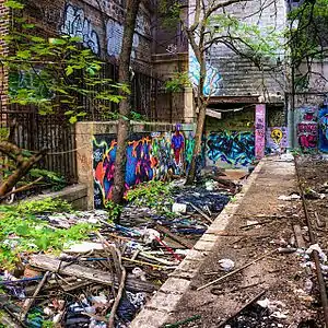 Although the station is no longer accessible, the site is home to many pieces of graffiti. Trash also litters the station and trees are sprouting where the tracks formerly lay. This station used to be accessible, although the route is not intended for use, through the Sedgwick Avenue station. A footbridge connects with an abandoned park, where the tunnel used to be open to urban explorers.[9] Today, however, the entrance is boarded up, and fences are placed with the intention to deter intruders. The building atop which the station sits is still visible at the intersection of East 162nd Street and Jerome Avenue.
