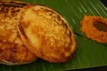 - 'Idli', Urad dal and rice steamed dumplings, often eaten with freshly-made chutney or with neyyi added and sprinkled with karrap podi (chili dal powder) or chutney and sambar.