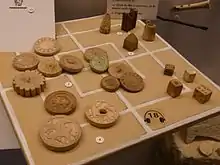 Findings include coins, tools, weapons, many horse fittings, small glass vessels, flat glass plates, furniture of stone, bone and wood, ceramic vessels and small earthenware objects. There is evidence of weaving and a smithy, with abundant metal objects.[6] These include ironwork from doors, furniture and chests.[3] The weapons do not include swords or lances, and suggest hunting rather than combat. Locally made chess pieces give evidence of an aristocratic lifestyle.[6]