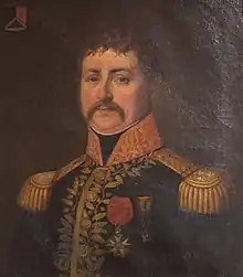 Napoleon appointed Boussart a Baron of the Empire on 19 March 1808 and posted the much-wounded veteran to Spain.[1] In 1808 he was with Pierre Dupont de l'Étang's corps in Andalusia. He led a cavalry brigade that consisted of the 6th Provisional Dragoon Regiment and numbering 620 troopers. On 17 July his command was detached with Dominique Honoré Antoine Vedel's division to march to Bailén. However, Vedel marched beyond the town in a mistaken belief that the Spanish had seized the passes to the north.[18] In fact, Theodor von Reding's 17,000-man Spanish corps arrived at Bailén on the 18th and occupied the town without opposition. This placed Dupont's 11,000 men squarely between Reding and Francisco Javier Castaños's corps.[19] In the Battle of Bailén, Dupont failed to break out of trap and asked for terms. While the negotiations were going on, Vedel's division returned. Boussart's dragoons attacked and captured about 1,000 Spanish troops. When a Spanish delegation warned Vedel that there was a truce in force, he ordered his soldiers to cease fire. When Dupont ordered him to release the prisoners taken during the parley, Vedel did so. As Dupont surrendered, Vedel began retreating north in accordance with secret orders from his superior. Later, when the Spaniards threatened to massacre Dupont's men unless Vedel was included in the capitulation, Dupont sent an order to Vedel to return to Bailén and surrender. Amazingly, Vedel followed the order even though his division was not surrounded. This more than doubled the total of unwounded prisoners taken from 8,242 to 17,635.[20] While Dupont and the French generals were returned to France, the enlisted men spent the rest of the war in prison hulks or on the bleak island of Cabrera and half of them died of disease or starvation.[21]