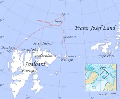 Starting out for Franz Josef Land to the south-east on 22 July, the three soon found that their struggle across the ice, which had ridges two stories high, was hardly bringing the goal any nearer: the drift of the ice was in the opposite direction, moving them backward. On 4 August they decided, after a long discussion, to aim for Sjuøyane in the southwest instead, hoping to reach the depot there after a six- to seven-week march, with the help of the current. The terrain in that direction was mostly extremely difficult, sometimes necessitating a crawl on all fours, but there was occasional relief in the form of open water—the little boat was apparently a functional and safe conveyance—and smooth, flat ice floes.