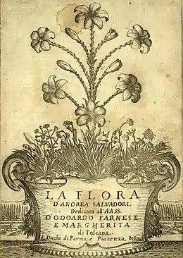 One of the distinguishing features of Salvadori's opera libretti was his extensive use of the chorus not only to conclude each act but also to link scenes within an act or to frame the singers' solo pieces.[1] He was a pioneer in the sacred opera genre (azione sacra) for which he wrote La regina Sant'Orsola (The Queen Saint Ursula) in 1624 and Istoria di Iudit (The story of Judith) in 1626. According to musicologist Kelley Harness, La istoria di Iudit was the basis for Martin Opitz's libretto for Judith (1635) and may well have influenced Giulio Rospigliosi's later libretti on religious subjects. Rospogliosi had attended the performance of La istoria di Iudit marking Cardinal Francesco Barberini's visit to the Medici court.[1] A notable example of Salvadori's secular operas was La Flora which was performed as part of the celebrations for the marriage of Margherita de' Medici and Odoardo Farnese, Duke of Parma in 1628.