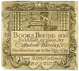Barclay was one of a group of Scottish bookbinders and booksellers who, at the age of 21, emigrated to the colonies and worked in Boston before and during the War for American Independence. His brother John arrived at Boston six years thereafter.[4] A small percentage of bookbinders ever distinguished their work by including their signature trade label on the inside cover of the works they bound. Subsequently bookbinder's trade labels are seldom found in the various works that were published in eighteenth-century colonial America. The various works bound by Andrew Barclay containing such labels are considered among the rare exceptions to that advent, with only a few known surviving examples.[5] Historians in this field have searched the rare book departments in various public and university libraries for these labels and have only found several examples. They maintain that the books containing binder's trade labels have largely gone unnoticed or unidentified and hope that more examples are yet to be found pending continued searches.[6]