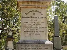 {{cite web}}: CS1 maint: unfit URL (link) - "Barlow, Andrew Henry". Grave Location Search. Brisbane City Council. Archived from the original on 22 March 2014. Retrieved 22 March 2014.