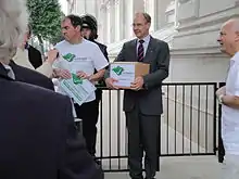 In July 2010, Deputy Prime Minister Nick Clegg announced plans to normalise the size of constituencies to around 77,000 with plans for part of the island to be represented by a mainland MP, something which has not happened since 1832.[23] Two exceptions to the boundary changes had been made to Scottish islands but it was felt that as the Isle of Wight was geographically closer to the mainland, such an exception would not be necessary.[24] The One Wight campaign, led by Turner launched with a petition on 23 July 2010 and within the first week over 1,500 people had signed,[25] which had increased to 5,000 by the middle of August.[26] The target of 10,000 signatures was reached over the Garlic Festival weekend in August with the final figure of 17,529 before the petition reached Downing Street.[27]