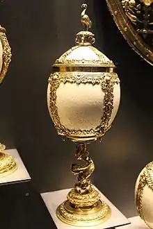 Melville received a pension from the lands of Crossraguel Abbey, and in June 1590 his servants James Boswall and David Ardeis witnessed his receipt for payment.[31] In October 1590 he made an inventory of silver plate used in the king and queen's household with Jerome Bowie, the Master of Wine Cellar. This includes two silver ships or nefs and an ostrich egg cup, described as an "ostrix eg coupe garnessit in silver dowble overgilt".[32] In 1591 he was on hand to protect the King at Holyroodhouse when he was surprised by Francis Stewart, Earl of Bothwell. Melville had a house on the north side of Holyrood close. He armed himself and entered the palace through the Abbey using a secret passage.[33]