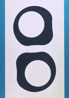 In the 1980s, Spence moved away from a rectilinear vocabulary, incorporating arcs, spirals and triangles and biomorphic shapes into his work.[36][5] His images initially consisted of singular, iconic images in limited colors that were embedded in heavily textured surfaces and read like graphic language symbols or fragments of advertising logos.[24][36] As the decade progressed, he turned increasingly to tongue-in-cheek, schematic renderings of common objects and architecture or modernist furniture (e.g., Light, 1987), whose inspirations and eccentric perspectival views (often overhead) only became apparent through the picture titles.[24][30][6] For example, Swivel Chairs (1988) drew on the well-known Eames armchair design, while Blue Canoe (1988) presented a field of horizontal stripes, two of which were blue and altered to mimic half-canoe shapes.[7][9]