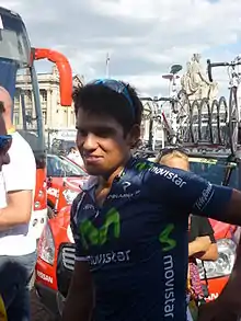 Amador is the son of Rodolfo Amador, a Costa Rican and Raisa Bikkazakova, a Russian immigrant who arrived in the country after meeting and marrying Amador's father. He is the youngest of three brothers. He started cycling professionally at the age of 20 in 2006, but started cycling at a very early age.[8] Amador was selected to carry the flag for Costa Rica at the 2011 Pan American Games opening ceremony.[9] He is the first Costa Rican to ever ride the Tour de France. In 2012, Amador won a mountainous stage 14 in the Giro d'Italia after breaking away from the group during the final descent right before the final climb. Though he was caught right at the finish of the climb he won the sprint in the end. In 2013, he finished 8th overall in the Tirreno-Adriatico.