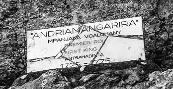 Andriamangarira was a king from the Merina Kingdom in Madagascar. He founded the royal city of Antsahadinta in around 1725. He was the grandson of King Andriamasinavalona,[1][2][3][4] son of Rasohanamanjaka of Ambohimahamanina, one of his daughters, with a certain Andriandambozozoro, Lord of Ivatobe avaratra and Malaza in Ambodirano Imerinatsimo. The tomb of Andriamangarira, qualified as a « Pirogue grave », and his « Tranomasina » (Sacred House) according to traditions, are still visible in Antsahadinta.[5]