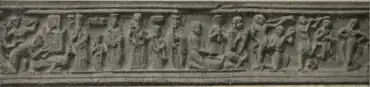 The emperors in Thessalonica continued to use the full imperial title, which they were entitled to per the agreement with Manuel, employing both the styles basileus (emperor) and autokrator (autocrat).[9] John VII regarded Andronikos V not just as his own successor, but also the future legitimate senior Byzantine emperor. John VII's entry into Thessalonica was commemorated in a Byzantine ivory pyxis (a cylindrical box with a lid), today housed at Dumbarton Oaks, which depicts the families of both John VII and Manuel.[10] The pyxis notably depicts Andronikos V more prominently than Manuel's son John VIII, despite John VIII being both older and higher in the line of succession.[11]