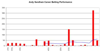 Born in Streatham, London, Sandham made his Surrey debut in 1911, and was capped in 1913. In his 26 years at the county Sandham formed a formidable opening partnership with Jack Hobbs, and the two put on a hundred for the first wicket on 66 occasions, the highest of these the 428 they accumulated against Oxford University in 1926. He passed 2,000 runs in eight seasons, and during the middle part of his career between 1924 and 1931 averaged above 50 in all but two years. He scored an unbeaten 292 against Northants, being denied his triple century only by Percy Fender's declaration, and still holds three record Surrey partnerships, including the 173 he put on with Andy Ducat for the 10th wicket at Leyton after suffering a bout of food poisoning.[1]