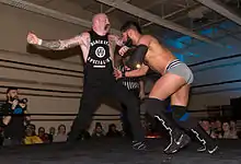 In March 2017, Williams appeared at Joey Janela's Spring Break, successfully teaming with Penelope Ford in an intergender tag team match against Guilmette (under his Braxton Sutter ring name) and his wife Allie.[17] Janela had suggested that Williams should wrestle either Nikolai Volkoff or Glacier at the event, but he declined, preferring the intergender matchup instead.[18] September saw the beginning of Williams and Guilmette regularly teaming with each other, and in their first match at a Pro Wrestling Rampage event, they won the PWR Tag Team Championship, defeating the Upper Echelon (Colby Redd and P. B. Smooth).[19] However, this reign was short-lived, lasting 63 days. In their first defence of the title, Williams was absent and was replaced by JJ Rumham (as he was playing in Newcastle during the Low Teens tour);[20] the pairing of Guilmette and Rumham were defeated by the Homewreckers (Anthony Gaines and Jet Rebel).[21] Known as the Butcher and the Blade, Williams and Guilmette predominately wrestled in promotions across the Northeast, as well as in Ottawa, where Capital City Championship Combat (C4) is based.