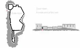 The Anevo Fortress is dominated by its fortified inner city or citadel, surrounded by defensive walls with gates and towers. The entire fortress was around 7,000–8,000 square metres (75,000–86,000 sq ft) in area, of which 5,000 m2 (54,000 sq ft) are taken up by the citadel and other archaeological remains, the unfortified part of the city measured around 1,000 m2 (11,000 sq ft) and a monastery with adjacent buildings amounted to 1,000–1,500 m2 (11,000–16,000 sq ft). In total, the Anevo Fortress is thought to have had eight defensive towers, of which only several have been preserved. The towers are either rectangular or polygonal in shape,[5] and their ruins reach up to 12 metres (39 feet) in height.[6]