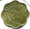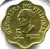 5¢ | 19 mm (8-pointed rounded scallop edge) | 2.40g | Brass | Plain | State title, Melchora Aquino, value | "ANG BAGONG LIPUNAN," BSP logo, year of minting | March 31, 1975 | January 2, 1998 |