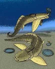 Angarichthys hyperboreus is an extinct homostiid arthrodire placoderm from the Middle Devonian (either upper Eifelian or lower Givetian) of Siberia.[1] It is known from an infragnathal plate, an intero-lateral plate, and a marginal plate found from the Middle Devonian strata of the Tynep Series formation, in the Bakhta River basin, Tunguska Plateau. A. hyperboreus differs from Homosteus in that the former's marginal plate has a ridge where the central plate would have overlapped it,[1] and in the infragnathal, which is curved sigmoidally, and bears at least seven tooth-like prongs nearer to the functional anterior end (the plate, which is fragmentary, suggests that the intact plate would have born several more).[1]