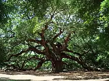 Angel Oak is a Southern live oak (Quercus virginiana) located in Angel Oak Park on Johns Island near Charleston, South Carolina. The tree is estimated to be 400–500 years old.[1] It stands 66.5 ft (20 m) tall, measures 28 ft (8.5 m) in circumference, and produces shade that covers 17,200 square feet (1,600 m2). Its longest branch distance is 187 ft[2] in length. Angel Oak was the 210th tree to be registered with the Live Oak Society.[3][4][5]