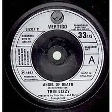 "Angel of Death" is a song by rock band Thin Lizzy featured on their Renegade album,[1] released as a single in the United States. The tune peaked at No. 38 on the Mainstream Rock chart.[2] The song was a collaboration between band leader Phil Lynott and Darren Wharton, who had joined the band as a keyboard player in 1980. Angel of Death was premiered live in August 1981 when its lyrics were rather different from the later released versions.[3] The opening number of Thin Lizzy's live set during the Renegade world tour of 1981/2 when it heralded the band on stage with the sound of air-raid sirens, Angel of Death was also an integral part of the Thunder and Lightning live set in 1983.