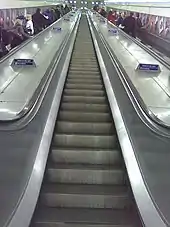 Angel is one of fourteen stations to have only escalator access to the platforms.[21] With a vertical rise of 90 feet (27 m) and a length of 200 feet (61 m), the escalators at Angel station are the longest on the Underground,[8][9] and in the United Kingdom.[22]