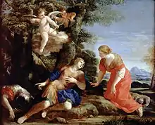 Angelica and Medoro was a popular subject for Romantic painters, composers and writers from the 16th until the 19th century.[1] Angelica and Medoro are two characters from the 16th-century Italian epic Orlando Furioso by Ludovico Ariosto. Angelica was an Asian princess at the court of Charlemagne who fell in love with the Saracen knight Medoro, and eloped with him to China. While in the original work, Orlando was the main character, many adaptations focused purely or mainly on the love between Angelica and Medoro, with the favourite scenes in paintings being Angelica nursing Medoro, and Angelica carving their names into a tree, a scene which was the theme of at least 25 paintings between 1577 and 1825.[2]