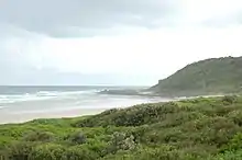 The beach is headed off by rocks near Black Head on the southern end (pictured) and spreads to its northern limit at Flat Rock, a popular fishing zone.