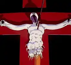 Lilith (リリス, Ririsu) is the second Angel. It is kept in the Terminal Dogma, the deepest section of the Nerv headquarters.[59] Lilith's face is covered with a mask on which are drawn the seven eyes of a symbol called the Seele emblem.[60][61] Lilith has the appearance of a white, anthropomorphic giant whose hands are nailed to a red cross. Instead of lower limbs, it has small, humanoid legs.[62] Few people know Lilith's true identity; even those who know about its existence are made to believe it is Adam, the first Angel.[63] Lilith is revealed by the Angel Tabris in the twenty-fourth episode of the series; Tabris cannot identify Lilith until seeing it. The soul of the Angel is kept inside Rei Ayanami; when the soul joins the body, Lilith initiates the Third Impact, an event in which the souls of all human beings merge into one being. In the film The End of Evangelion (1997), the Angel's body unites with Rei, takes on the form of a girl, and grows to the size of the Earth, developing a giant AT Field.[64]