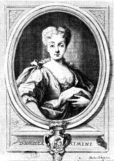 Angiola Cimini (1700-1727) was the daughter of Italian nobleman, Giuseppi Cimino, avvocato fiscale del real patrimonio, and of Anna d'Arieta-Crespo, member of a noble family from Castigliana.[1] She is most famous due to her friendship with the philosopher Giambattista Vico. He wrote a eulogy for her funeral in 1727 that is stated to be a "gem of eloquence", Angiola died at the age of 27.[2]: 169 Sent to a school for Spanish noble ladies, Angiola was adored among her schoolmates for her ability to heal their ailments.[2]: 171 She married to become the Marchioness of Petrella.