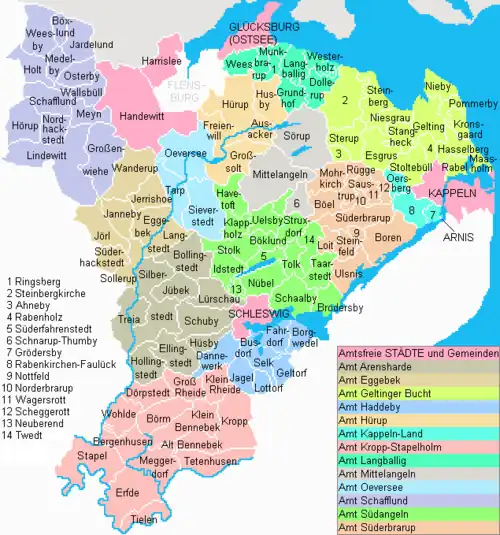 | Largest towns | 1. Flensburg (Flensborg) 2. Schleswig (Slesvig) 3. Kappeln (Kappel) 4. Glücksburg (Lyksborg) 5. Mittelangeln (Midtangel) |