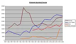 The game continued to struggle during this decade, with only five senior clubs affiliated in 1909, increasing to seven senior and nine junior clubs in 1910. At the annual meeting of the QBFA in September 1910, the secretary reported that the association was "without doubt, the strongest association that had existed for some considerable time."[61] Australian Rules football appeared to be faring little better in Brisbane around this time, as the Ipswich A Grade side beat Brisbane 102 points to 1.[62] It was also 1909 that saw the inaugural Brisbane Rugby League competition, with that game ultimately becoming the dominant code in Brisbane (see below).