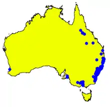 It grows in open forest and woodland, in association with such species as Sydney peppermint (Eucalyptus piperita), bangalay (E. botryoides),[23] grey gum (E. punctata), blue-leaved stringybark (E. agglomerata), white mahogany (E. acmenoides), broad-leaved white mahogany (E. umbra), large-fruited red mahogany (E. scias), red bloodwood (Corymbia gummifera), yellow bloodwood (C. eximia), pink bloodwood (C. intermedia) lemon-scented gum (C. citriodora),[6] turpentine (Syncarpia glomulifera), forest oak (Allocasuarina torulosa),[23] and cypress pines (Callitris species),[6] and in hind dune communities with wedding bush (Monotoca elliptica) and burrawang (Macrozamia communis).[23]