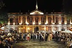 In 1608, an earthquake caused damage many of the buildings in the city. Between 1610-1611, the building was remodelled, resulting in the refurbishment of the building and expand the municipal square.[1] Drawings of the building at that time showed a two-storey building with its front facade including three divisions, with its lateral wings with single windows over sill on the ground floor and two windows with cornices on the second floor.[1] The central section included an arcade with five rounded arches surmounted by varanda supporting an architrave, and accessible by lateral staircases.[1] At the top of the central wing was a two-storey rectangular belltower, crowned by pinnacles. In addition to its administrative municipal function, the building sheltered simultaneously the jail and courts services.[1]