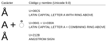 For compatibility reasons, Unicode includes the formal symbol U+212B Å ANGSTROM SIGN (HTML entity Å, Å, or Å), which is deprecated.[25] The angstrom sign is normalized into U+00C5 Å LATIN CAPITAL LETTER A WITH RING ABOVE (HTML entity Å, Å, or Å).[26] The Unicode consortium recommends to use the latter.[25]
