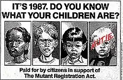 Marvel Comics used a novel approach in advertising the crossover event. A major element within the stories at the time was the public's growing concern over the "mutant menace" and Senator Robert Kelly's proposed Mutant Registration Act, which foreshadowed the dystopian future shown in "Days of Future Past". Marvel distributed postcard-size mock advertisements supporting the act in comic book stores as well as their various titles cover dated "November 1987". Asking "Do You Know What Your Children Are?", the card further suggested that anyone who knew themselves to be a mutant should fill out the form on the back and mail it in to register themselves with the government.