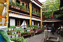 The word Ani mean "nun" and "tshamkhang" means a place for spiritual retreat, or hermitage.[1] Ani Tsankhung occupies a yellow building in the Barkhor area of downtown Lhasa.[2] It is southeast of the Jokhang temple, and is the only nunnery in the old city of Lhasa.[3] The building is three stories high.[4] In the main hall there is an image of Chenresig, the multi-armed Bodhisattva of Compassion. Behind this there is a 7th-century meditation chamber that was used by Songtsen Gampo.[2] The nunnery has a collection of thirteen Thangkas from Ming and Qing dynasties depicting Buddhas and Bodhisattvas.[5]