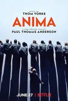 Anima was accompanied by a 15-minute film directed by Paul Thomas Anderson. The Anima film was played in some IMAX theatres and released on Netflix on the day of the album release.[11] It features Yorke's partner, the actress Dajana Roncione, plus choreography by Damien Jalet, cinematography by Darius Khondji and projections by Tarik Barri.[3] In the film, Yorke rides a train of uniformed passengers ("Not the News"), meets the eye of a woman (Roncione) and pursues her when she forgets her bag ("Traffic"). They meet in the street, dance together and board a tram ("Dawn Chorus").