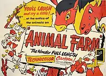Animal Farm is a 1954 adult animated[7] film directed by animators John Halas and Joy Batchelor. It was produced by Halas and Batchelor and funded in part by the Central Intelligence Agency (CIA), who also made changes to the original movie script.[8][9][10] It was based on the 1945 novel of the same name by George Orwell. Although the film was a financial failure and took 15 years to generate a profit, it quickly became a staple in classrooms across the United Kingdom, the United States[11][12][13] and other English-speaking countries like Australia, Canada, and New Zealand into the 1980s.