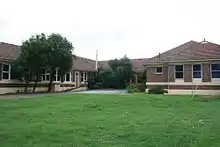 The main facade of the building looks to the east and a grassed area where a large, circular garden bed formed by concrete edging is positioned. Its shape and extent are significant but not the edging. In its centre is a steel flagpole dating from the period of the School's occupation during WWII. The building wings facing to the west enclose a small courtyard which has large sections of concrete pathway and some plantings, none of which are significant.[1]
