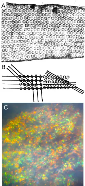 The tapetum of Carnivora (cats, dogs, lions etc.) contains remarkably regular arrays of rodlets, and reflects light from planes of the lattice by Bragg's Law (Fig. 2A). Each domain of rodlets has a different spacing and reflects a different colour from the main plane (shown horizontal in Fig. 2B) so with near-parallel illumination, spots of different colors are seen (Fig.1C). Because there are lattice planes at many inclinations, the tapetum as a whole reflects diffusely and is scarcely iridescent.