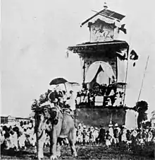 In the Meitei epic of the Khamba and Thoibi, the crown prince Chingkhu Akhuba of ancient Moirang and Kongyamba, planned to kill to Khuman Khamba.[4] Kongyamba and his accomplices together threatened Khamba to give up Moirang Thoibi, which Khamba rejected. Then they fought, and Khamba bet all of them, and was about to kill Kongyamba, but the men that stood by, the friends of Kongyamba, dragged Khamba off, and bound him to the elephant of the crown prince, with ropes. Then they goaded the elephant, but the God Thangching stayed it so that it didn't move. Finally, Kongyamba lost patience. He pricked a spear to the elephant so that it moved in the pain. But it still didn't harm Khamba. Khamba seemed to be dead. Meanwhile, on the other hand, Goddess Panthoibi came in a dream to Thoibi and told her everything that was happening. So, Thoibi rushed to the spot and saved Khamba from the elephant torture.[5]
