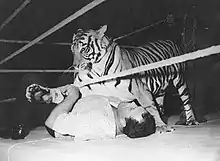 The usage of animals in professional wrestling has varied through the profession's history. Animals that have been used as opponents to humans in matches include bears, tigers, cheetahs and orangutans.[2][3][4][5]