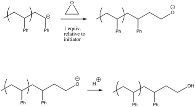 Living anionic polymerization allow the incorporation of functional end-groups, usually added to quench polymerization. End-groups that have been used in the functionalization of α-haloalkanes include hydroxide, -NH2, -OH, -SH, -CHO,-COCH3, -COOH, and epoxides.